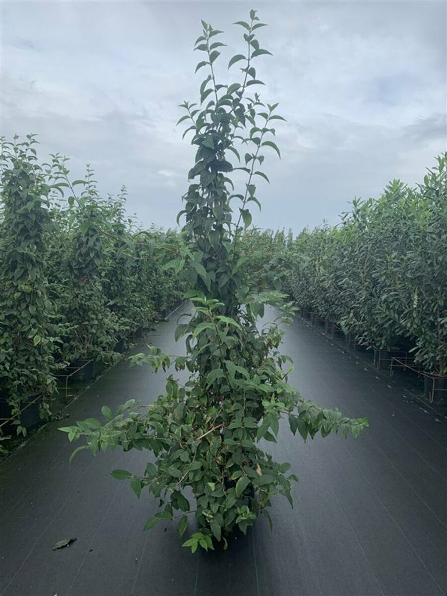 Betekend dat het een leiboom is, met een stamomtrek van 16-18 cm, een stamhoogte van 2.00 m (vanaf bovenkant pot tot het leirek) en in een pot staat