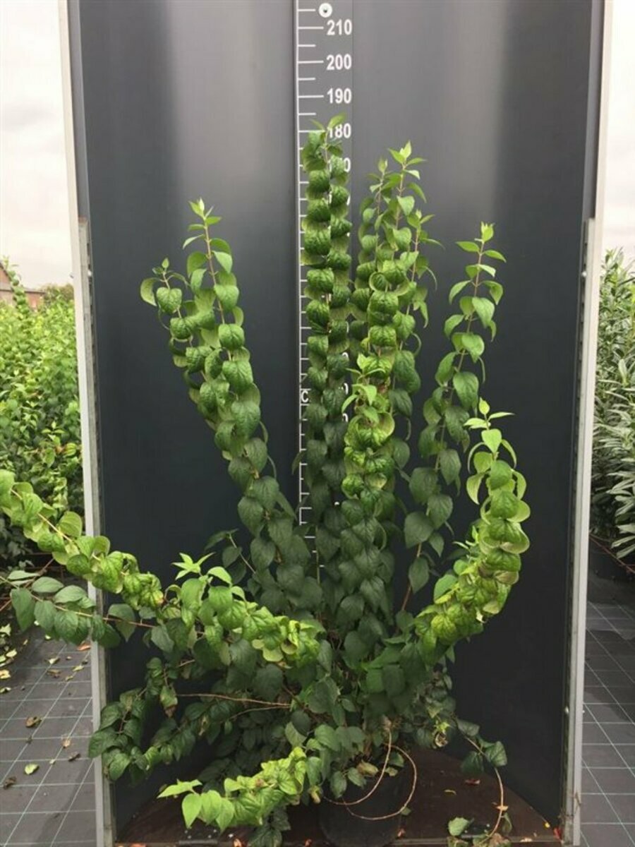 Betekend dat het een leiboom is, met een stamomtrek van 16-18 cm, een stamhoogte van 2.00 m (vanaf bovenkant pot tot het leirek) en in een pot staat